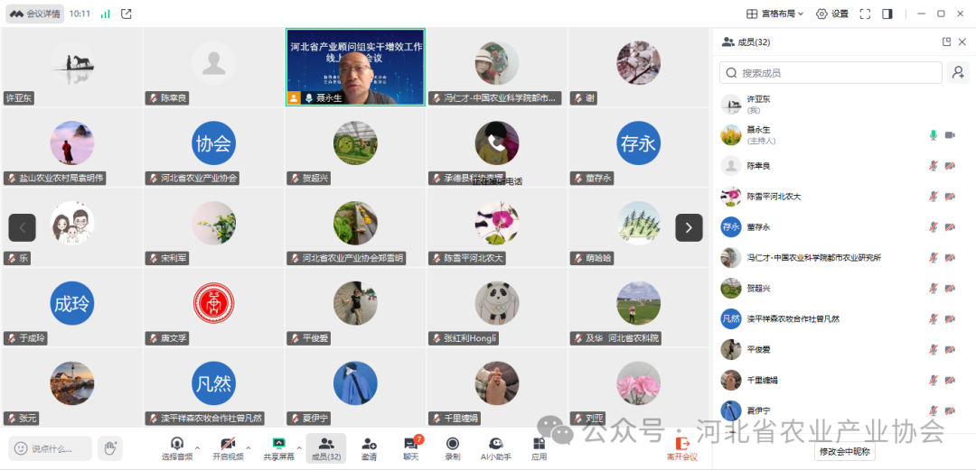 7月9日,河北省农业产业协会组织召开产业顾问组实干增效工作线上会商会议。会议全面梳理了河北省产业顾问组实干增效项目任务、工作进展及阶段性成效,传达了中国科协关于项目总结等最新工作要求,部署了下一步工作。聂永生常务副会长主持会议,承德、丰宁、滦平、盐山等顾问组组长及有关专家做了发言。大家一致表示,将全力配合、积极推进项目后续工作,确保项目的顺利开展,争取达到最优的项目成果。河北省承德、丰宁、滦平、望都、盐山5个产业顾问组项目县科协、农业农村局等部门相关负责人,产业顾问组专家成员,各县本土实用人才代表等50余人报名参会。