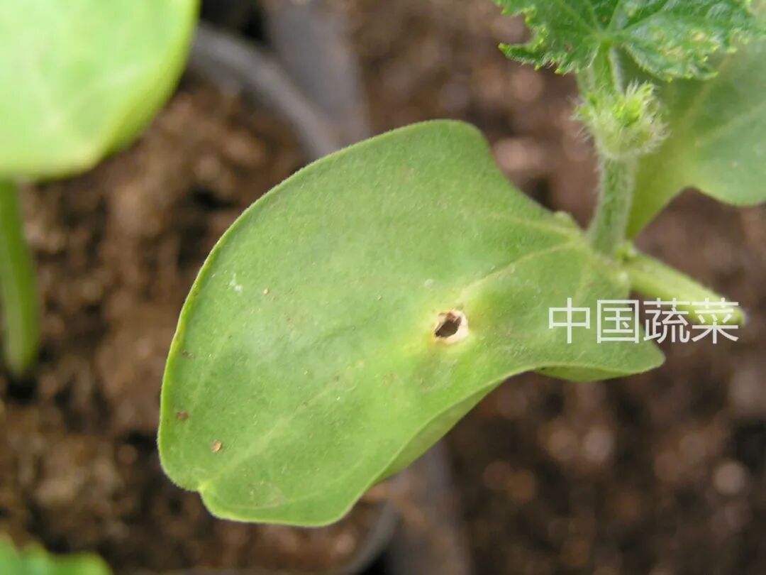 幼苗感病:子叶上产生黄白色圆形斑点,真叶发病,产生黄白色近圆形斑,后变暗褐色,穿孔开裂。